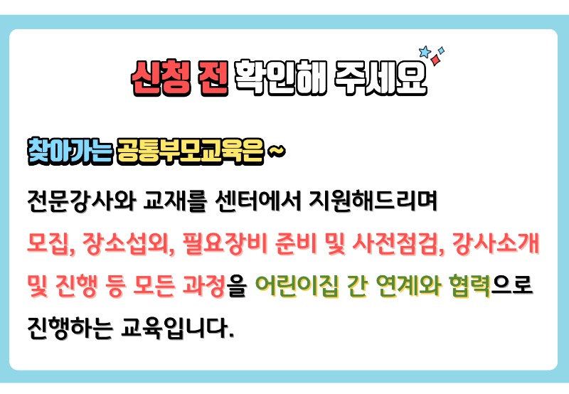 | 유의사항 | ** 관할구와 상관없이 연합은 가능하나 신청은 반드시 영통, 팔달구 어린이집에서 신청합니다. ** 교육 총원은 16인 이상으로 구성합니다. ** 5~6월 중 원하는 날짜에 신청하며 중복 신청이 불가합니다. ** 신청일 기준 7일 이후에는 취소가 불가하므로 신중히 신청하시기 바랍니다. ** 홈페이지 신청 시 원장 외 직종은 접수 불가합니다. |